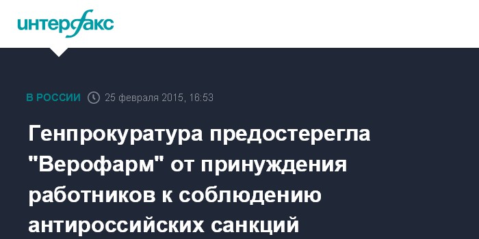 Москва. 25 февраля. INTERFAX.RU – Генпрокуратура России в связи с обращениями депутатов и сообщениями в СМИ организовала проверку американской фармацевтической компании "Верофарм" по фактам "понуждения работников к соблюдению режима антироссийских санкций", сообщили "Интерфаксу" в надзорном ведомстве в среду.