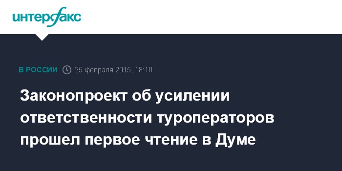 Москва. 25 февраля. INTERFAX.RU - Госдума на заседании в среду приняла в первом чтении законопроект, ужесточающий ответственность туроператоров.