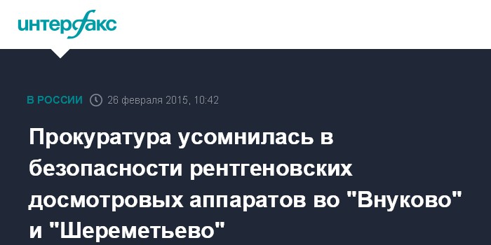 Москва. 26 февраля. INTERFAX.RU - Рентгеновские приборы, используемые для досмотра пассажиров в аэропортах "Внуково" и "Шереметьево", не прошли проверку на предмет безопасности для здоровья людей.