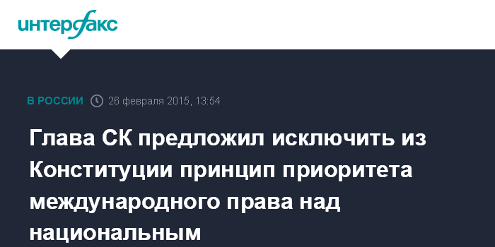 Москва. 26 февраля. INTERFAX.RU - Глава Следственного комитета России Александр Бастрыкин считает, что закрепленный в Конституции принцип безусловного приоритета норм международного права над национальным законодательством противоречит интересам страны.