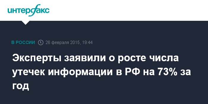 Москва. 26 февраля. INTERFAX.RU - Число утечек конфиденциальной информации в российских компаниях и организациях в 2014 году выросло до 1,97 тыс. случаев, что на 73% больше аналогичного показателя 2013 года (1,14 тыс.), следует из исследования компании InfoWatch.