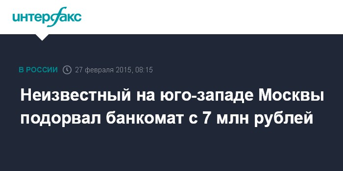 Москва. 27 февраля. INTERFAX.RU – Неизвестный на юго-западе Москвы попытался разрушить банкомат, в котором находилось более 7 млн руб., но скрылся, ничего не взяв, сообщили "Интерфаксу" в пресс-службе московской полиции.