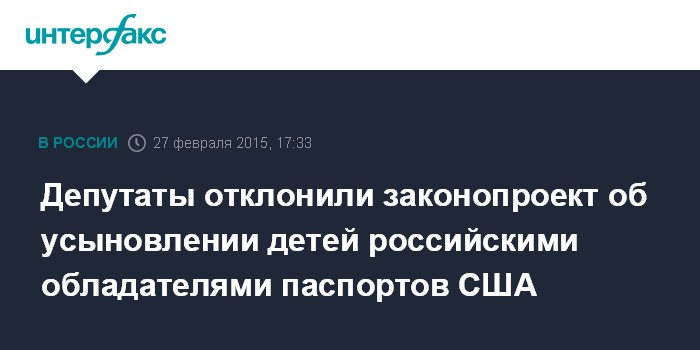 Москва. 27 февраля. INTERFAX.RU - Госдума в пятницу отклонила в первом чтении законопроект, предлагающий разрешить россиянам, имеющим американское гражданство, усыновлять сирот в РФ. Депутаты считают, что наличие второго паспорта и так не мешает гражданам РФ усыновлять российских детей.