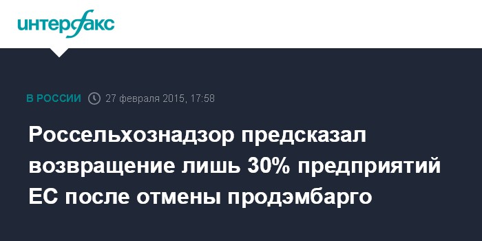 Москва. 27 февраля. INTERFAX.RU - После отмены российского продэмбарго на рынок РФ смогут вернуться не более 20-30% прежних поставщиков из ЕС, считает руководитель Россельхознадзора Сергей Данкверт.