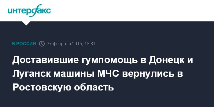 Москва. 27 февраля. INTERFAX.RU - Автомобили МЧС России, доставившие в пятницу помощь в Донецк и Луганск, пустыми вернулись в Ростовскую область, сообщил замначальника Национального центра управления в кризисных ситуациях МЧС Олег Воронов.