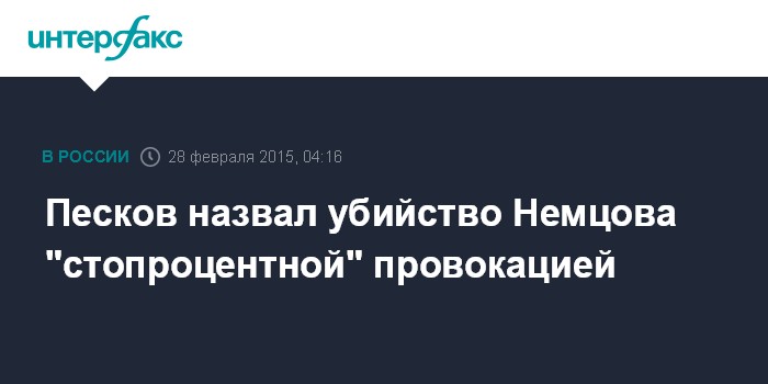 Москва. 28 февраля. INTERFAX.RU - Пресс-секретарь президента России Дмитрий Песков убежден, что убийство оппозиционного политика Бориса Немцова, совершенное в центре Москвы в ночь на субботу, является провокацией.