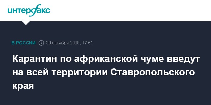 Москва. 30 октября. INTERFAX.RU - Власти Ставрополья считают необходимым ввести карантин на территории всего региона в связи с выявлением новых очагов африканской чумы свиней.