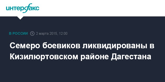 Москва. 2 марта. INTERFAX.RU - В ходе спецоперации в Кизилюртовском районе Дагестана ликвидированы семеро боевиков, введенный 25 февраля режим КТО отменен, сообщили агентству "Интерфакс" в Оперативном штабе в республике.