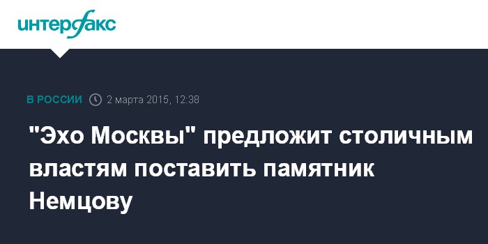 Москва. 2 марта. INTERFAX.RU - Редакция радиостанции "Эха Москвы" в ближайшее время обратится в столичную мэрию с предложением о присвоении улицы в городе имени Бориса Немцова или установлении памятника оппозиционеру.