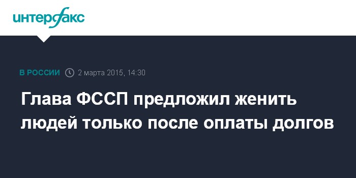Москва. 2 марта. INTERFAX.RU - Должникам могут ограничить возможность вступления в брак до оплаты долгов, заявил глава Федеральной службы судебных приставов (ФССП) Артур Парфенчиков.