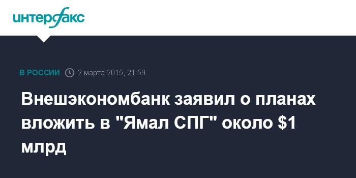 Москва. 2 марта. INTERFAX.RU - Внешэкономбанк (ВЭБ) планирует профинансировать проект "Ямал СПГ" примерно на $1 млрд, сообщил глава банка Владимир Дмитриев журналистам в Милане.