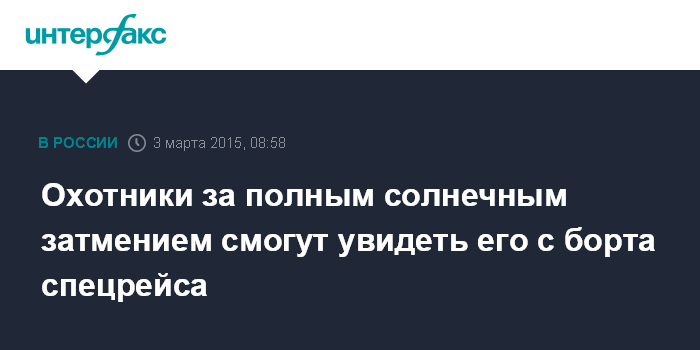 Москва. 3 марта. INTERFAX.RU - Специальный рейс компании "Нордавиа" 20 марта, в день полного солнечного затмения, вылетит из аэропорта Мурманска и совершит четырехчасовой полет над Баренцевым и Норвежским морями, чтобы его пассажиры смогли увидеть и запечатлеть редкое астрономическое явление.