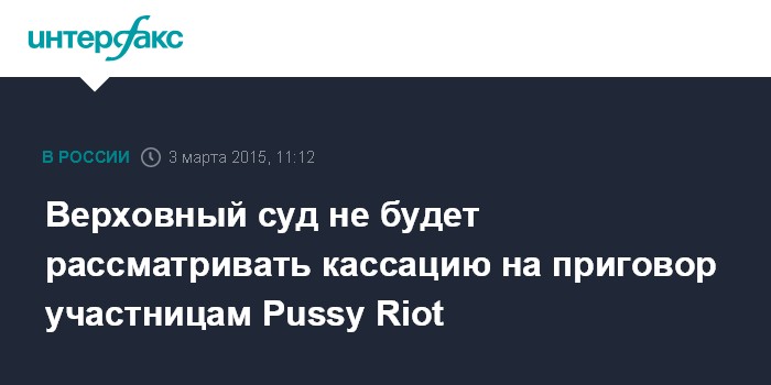 Москва. 3 марта. INTERFAX.RU - Верховный суд РФ отказал в рассмотрении жалобы на приговор участницам панк-группы "Pussy Riot" по делу о хулиганстве в Храме Христа Спасителя в Москве.