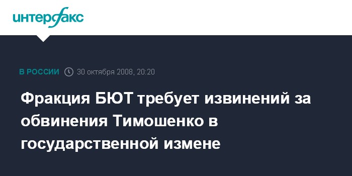 Киев. 30 октября. INTERFAX.RU - Фракция Блока Юлии Тимошенко требует извинений от Службы безопасности Украины за обвинения премьер-министра Украины Юлии Тимошенко в государственной измене, а спикер Арсений Яценюк обещает заслушать этот вопрос в парламенте.