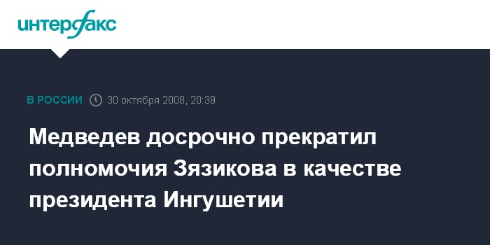 Москва. 30 октября. INTERFAX.RU - Президент РФ Дмитрий Медведев принял отставку президента Ингушетии Мурата Зязикова и назначил Юнус-Бека Евкурова временно исполнять обязанности президента Ингушетии, сообщила пресс-служба Кремля.