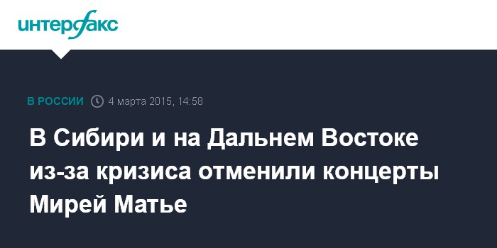 Москва. 4 марта. INTERFAX.RU - Концерты французской певицы Мирей Матье, объявленные в Красноярске, Новосибирске, Хабаровске и Владивостоке в мае 2015 года, не состоятся в связи с экономическим кризисом в России, сообщили организаторы тура на сайте новосибирской филармонии.