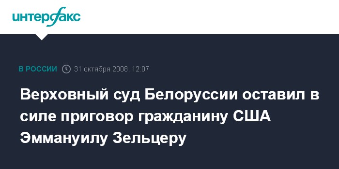 Минск. 31 октября. INTERFAX.RU - Верховный суд Белоруссии оставил в силе приговор гражданину США Эммануилу Зельцеру, сообщил журналистам адвокат Дмитрий Горячко.