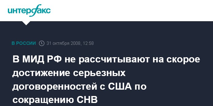 "К сожалению, обнадеживающиеся слова о важности продолжения российско-американского диалога по сокращению СНВ звучат лишь под занавес работы администрации Джорджа Буша, когда вряд ли можно рассчитывать на достижение серьезных договоренностей", - говорится в комментарии департамента информации и печати МИД РФ, распространенном в пятницу.