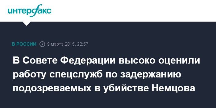 Москва. 9 марта. INTERFAX.RU - В Совете Федерации высоко оценивают оперативность и профессионализм, продемонстрированный правоохранительными органами и спецслужбами в деле поиска лиц, причастных к убийству известного политика Бориса Немцова.
