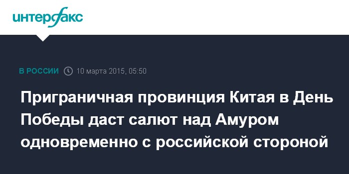 Москва. 10 марта. INTERFAX.RU - Власти провинции Хэйлунцзян (КНР, граничит с РФ по Амуру) планируют поддержать салютом празднование россиянами 70-летия победы в Великой Отечественной войне, сообщила "Интерфаксу" председатель Ассоциации прикладной экономики провинции Хэйлунцзян Чжан Чуньцзяо.