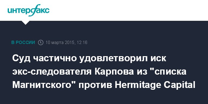 Москва. 10 марта. INTERFAX.RU - Мещанский суд Москвы во вторник частично удовлетворил иск бывшего следователя Павла Карпова, который расследовал дело юриста Сергея Магнитского, к фонду Hermitage Capital и его сооснователю Уильяму Браудеру и главе британской юридической компании Firestone Duncan Джемисону Файерстоуну.