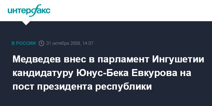 Москва. 31 октября. INTERFAX.RU - Президент России Дмитрий Медведев внес на рассмотрение Народного Собрания Ингушетия кандидатуру Юнус-Бека Евкурова для наделения его полномочиями президента республики, сообщила в пятницу пресс-служба главы российского государства.