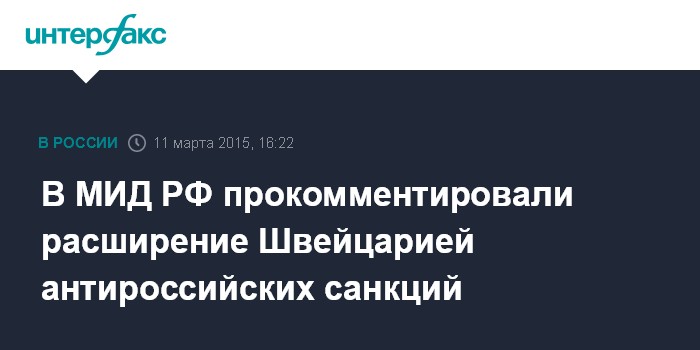 Москва. 11 марта. INTERFAX.RU - Решение Швейцарии вслед за странами ЕС расширить санкционный список в отношении России и Донбасса вызывает в Москве разочарование, говорится в комментарии департамента информации и печати МИД РФ, распространенном в среду