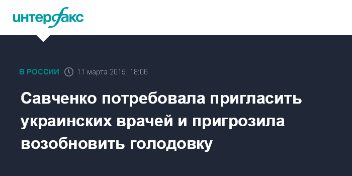 Москва. 11 марта. INTERFAX.RU - Украинская летчица Надежда Савченко, которую в России обвиняют в пособничестве в убийстве российских журналистов, с 16 марта возобновит голодовку, если к ней не допустят украинских врачей.