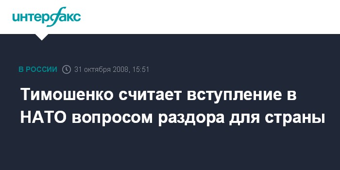 Москва. 31 октября. INTERFAX.RU - Премьер Юлия Тимошенко убеждена, что вопрос вступления Украины в НАТО на нынешнем этапе разделяет украинское общество и для решения этого вопроса необходим референдума.
