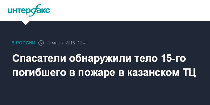 Москва. 13 марта. INTERFAX.RU - При разборе завалов в сгоревшем в Казани торговом центре "Адмирал" найдено тело 15-го погибшего, сообщили "Интерфаксу" в экстренных службах региона.