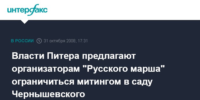 Москва. 31 октября. INTERFAX.RU - Петербургские власти предложили организаторам "Русского марша" 4 ноября вместо шествия ограничиться митингом в саду имени Чернышевского.