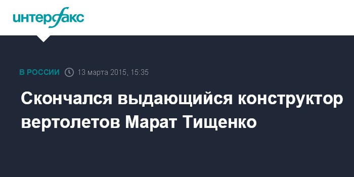 Москва. 13 марта. INTERFAX.RU - На 85-м году жизни скончался выдающийся ученый-аэродинамик, генеральный конструктор Московского вертолетного завода имени М.Л.Миля (1970-1991 годы) Марат Тищенко, сообщает пресс-служба холдинга "Вертолеты России".