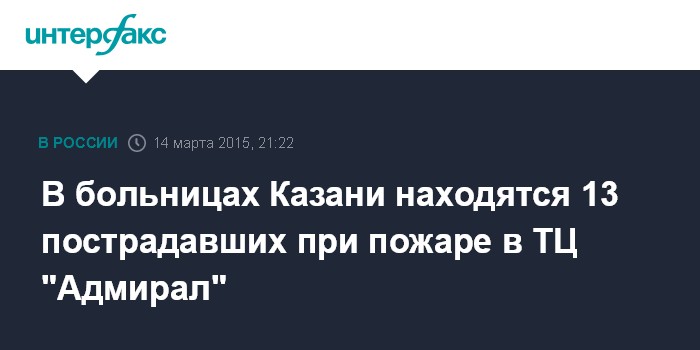 Москва. 14 марта. INTERFAX.RU - По состоянию на 18.30 Ммск в стационарах Казани находятся 13 человек, пострадавших при пожаре в торговом центре "Адмирал", - сообщается на сайте Минздрава Республики Татарстан в субботу.