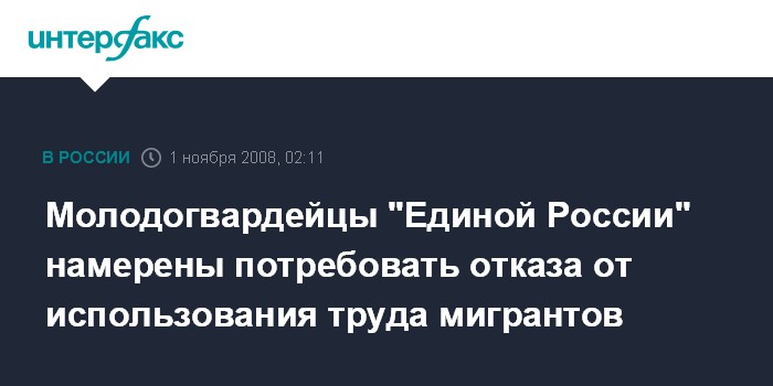 Москва. 1 ноября. ИНТЕРФАКС - Активисты молодежного движения "Молодая гвардия "Единой России" проведут в субботу в Москве акцию с требованием выслать трудовых мигрантов из России и отдать их рабочие места россиянам.