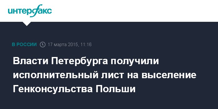 Москва. 17 марта. INTERFAX.RU - Власти Петербурга получили исполнительный лист по решению суда о возмещении долга по аренде и выселению Генерального консульства Польши из зданий на 5-й Советской улице.