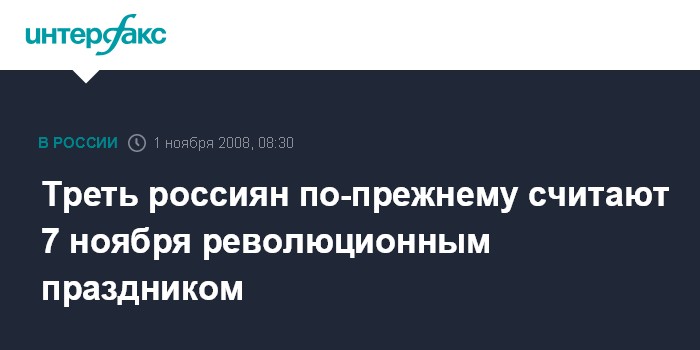 Москва. 1 ноября. INTERFAX.RU - Для трети россиян 7 ноября по- прежнему остается днем Великой Октябрьской социалистической революции, причем это мнение в обществе укрепляется, констатируют социологи.