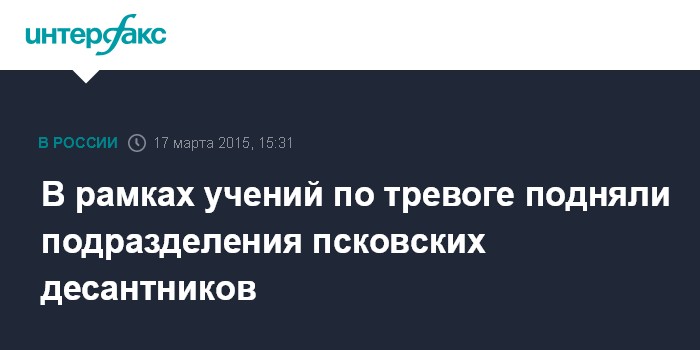Москва. 17 марта. INTERFAX.RU - Подразделения псковских подразделений Воздушно-десантных войск в рамках стратегической командно-штабной тренировки по управлению Вооруженными силами РФ выполнили мероприятия по приведению в полную боевую готовность, сообщило во вторник управление пресс-службы и информации Минобороны РФ.