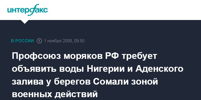 Москва. 1 ноября. INTERFAX.RU - Российский профсоюз моряков (РПСМ) подготовил требование о необходимости объявить воды у берегов Нигерии и Аденского залива близ Сомали, где постоянно происходят нападения пиратов, зоной военных действий.