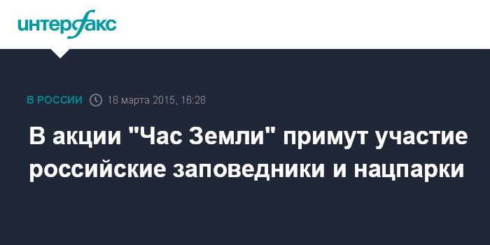 Москва. 18 марта. INTERFAX.RU - К международной акции "Час Земли" в 2015 году присоединятся национальные парки и заповедники России, сообщает в среду сайт Минприроды.