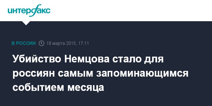 Москва. 18 марта. INTERFAX.RU - Россияне поставили убийство политика Бориса Немцова (53%) на первое место в рейтинге наиболее запомнившихся событий месяца, сообщили "Интерфаксу" в "Левада-Центре". Таким образом, впервые за долгое время верхняя строчка отдана не украинским событиям и не валютным колебаниям.