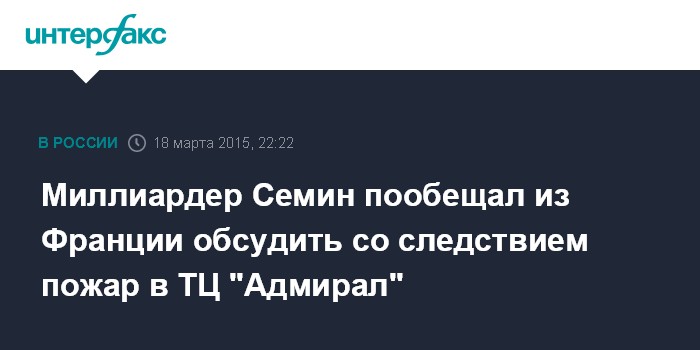 Миллиардер Семин пообещал из Франции обсудить со следствием пожар в ТЦ "Адмирал"