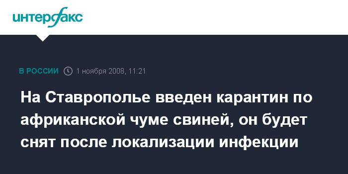 Москва. 1 ноября. INTERFAX.RU - В Ставропольском крае объявлен карантин в связи с угрозой распространения африканской чумы свиней. Он будет снят только после локализации инфекции и ликвидации ее очагов.