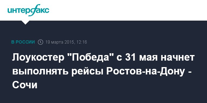 Москва. 19 марта. INTERFAX.RU – Лоукостер "Победа" (100-процентная дочка "Аэрофлота") с 31 мая вводит рейс по маршруту Ростов-на-Дону - Сочи, сообщила пресс-служба ростовского аэропорта. Полеты будут осуществляться на воздушном судне Boeing 737-800, которое рассчитано на перевозку 189 пассажиров. Время в пути - 1 час.