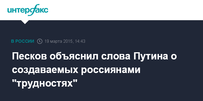 Москва. 19 марта. INTERFAX.RU - Пресс-секретарь президента РФ Дмитрий Песков пояснил журналистам фразу о "трудностях", которые россияне создают сами себе, произнесенную Владимиром Путиным на митинге-концерте "Мы вместе".