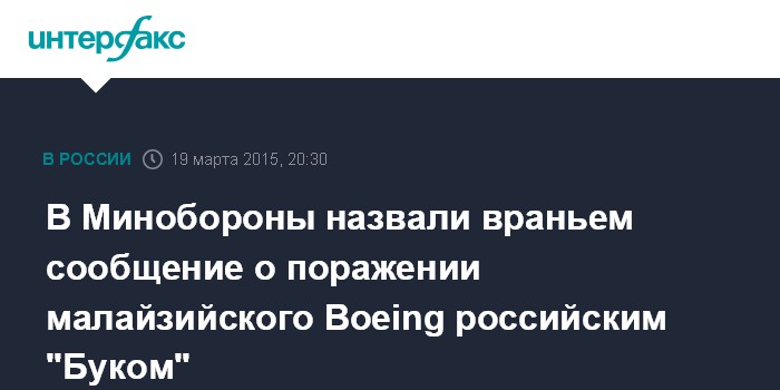 Москва. 19 марта. INTERFAX.RU - В Минобороны РФ подвергли критике сообщения украинских СМИ и спецслужб Украины о наличии доказательств поражения малазийского Boeing МН-17 российским зенитно-ракетным комплексом "Бук", назвав это враньем.