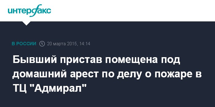 Москва. 20 марта. INTERFAX.RU - Советский районный суд Казани в пятницу избрал меру пресечения в виде домашнего ареста для бывшего пристава-исполнителя Минзили Сафиной по делу о пожаре в казанском ТЦ "Адмирал".