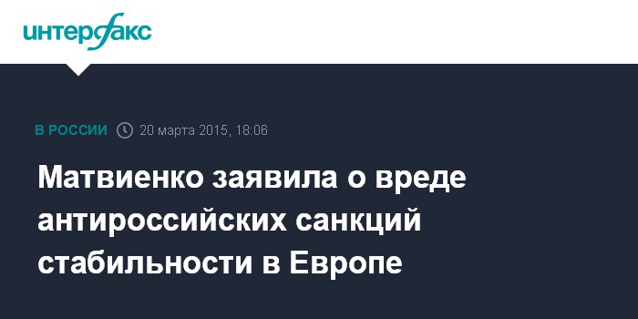 Москва. 20 марта. INTERFAX.RU - Введенные в отношении России санкции наносят ущерб европейской стабильности и безопасности, считает председатель Совета Федерации Валентина Матвиенко.