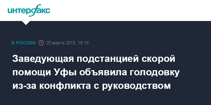 Москва. 20 марта. INTERFAX.RU - Заведующая Орджоникидзевской подстанцией станции скорой медицинской помощи (ССМП) Уфы Светлана Юсупова объявила голодовку, сообщил в пятницу координатор независимого профсоюза медиков "Действие" Андрей Коновал.
