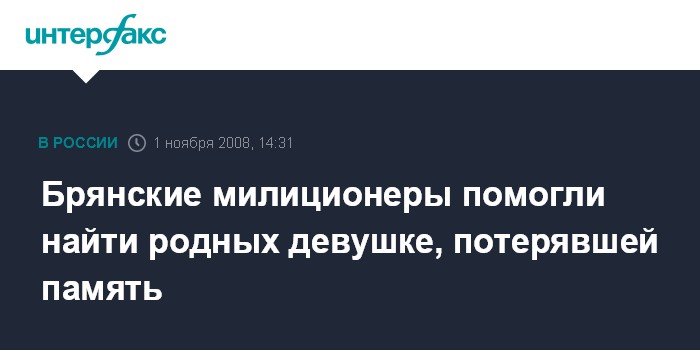 Брянск. 1 ноября. INTERFAX.RU - Брянские милиционеры нашли родных девушки, потерявшей память, сообщили "Интерфаксу" в пресс-службе регионального УВД.