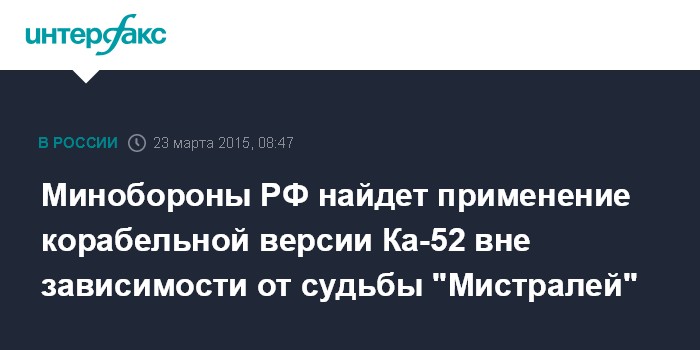 "Во-первых, уже строятся свои десантные корабли, и такой вертолет, как Ка-52К, будет востребован на кораблях нашего надводного флота. Так что связывать окончание опытно-конструкторской работы по этому вертолету с поставкой или не поставкой "Мистралей" было бы неправильно", - сказал Борисов, отвечая на вопрос, найдут ли корабельные Ка-52К применение в ВМФ России, если французские вертолетоносцы не будут поставлены.